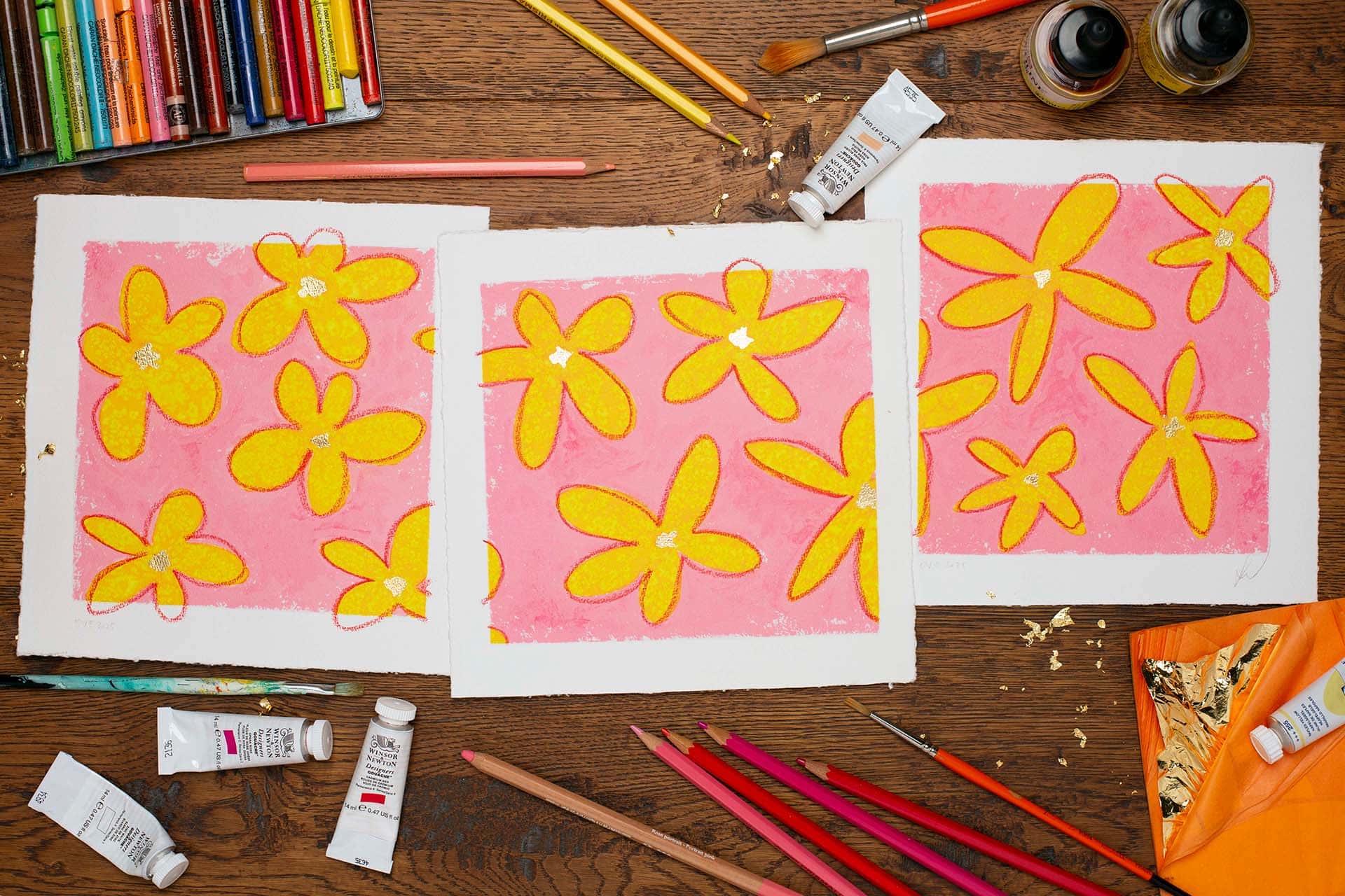 A Flower Power triptych. These are digital fine art prints, produced using a 12-color Giclée printing process from an original made in gouache and inks.