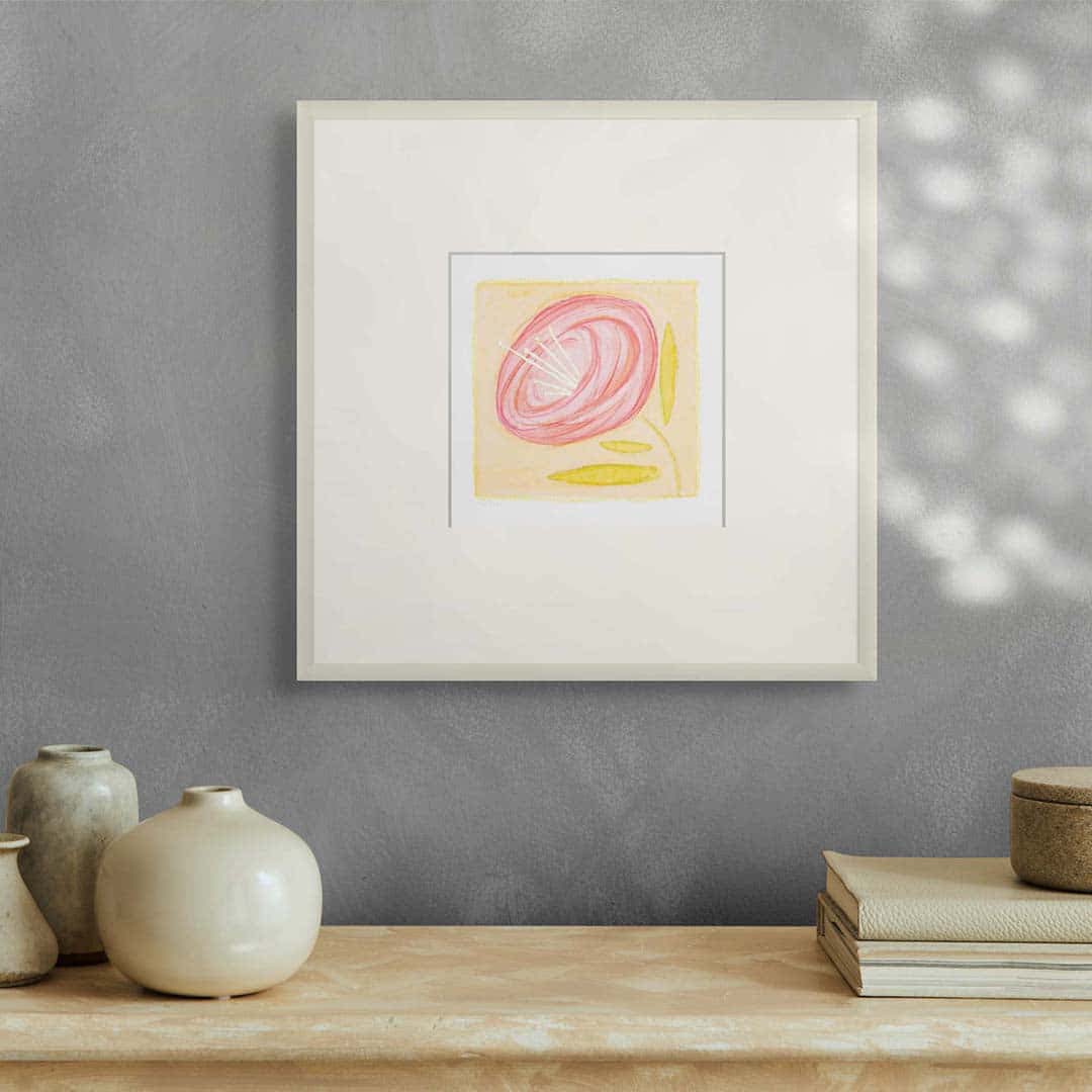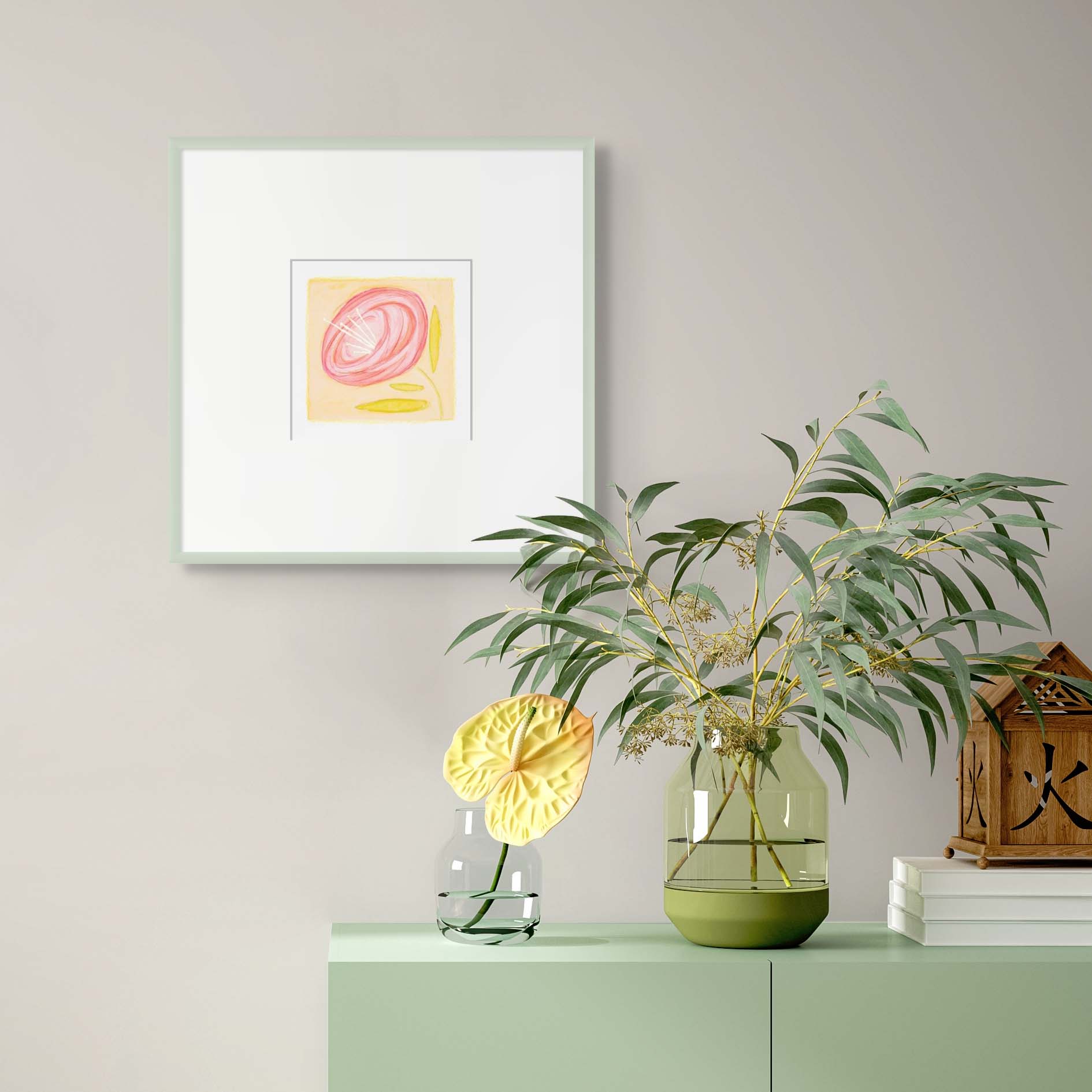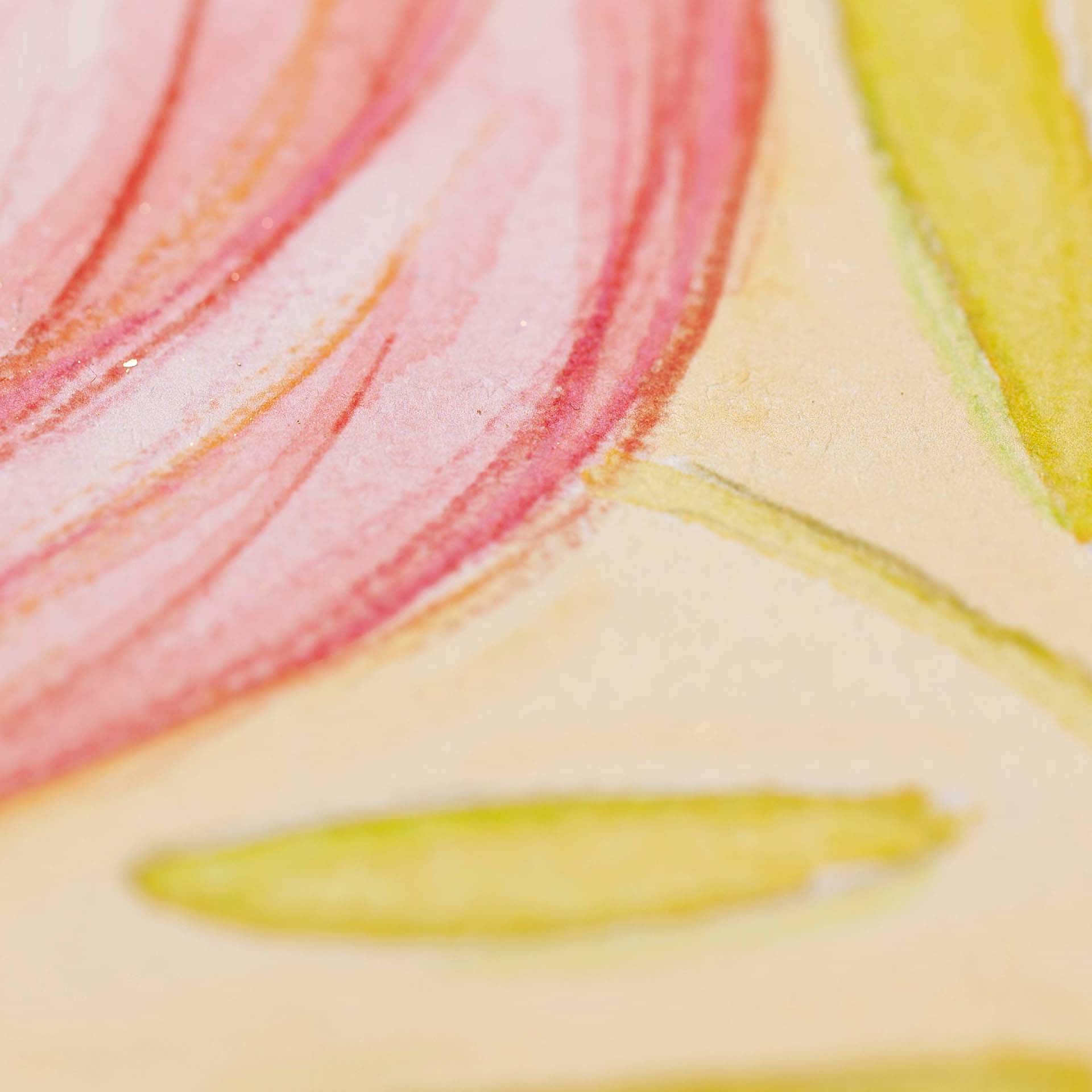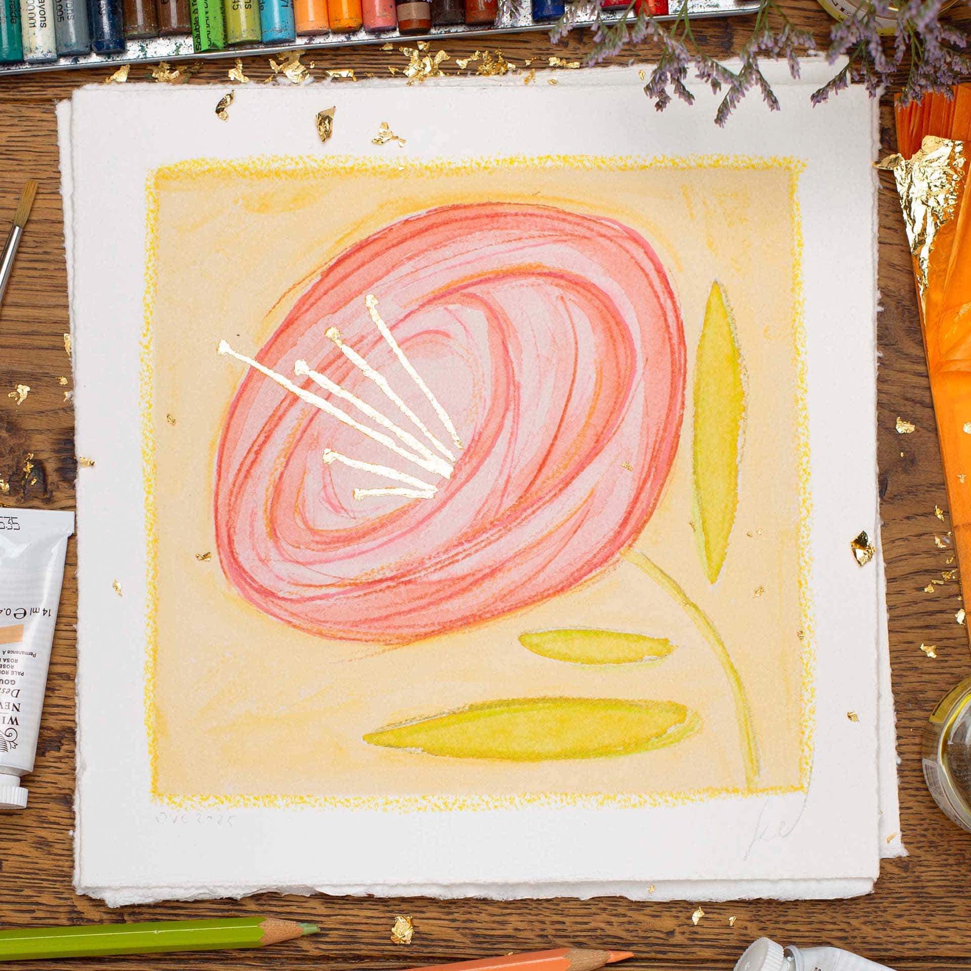This is a Peony digital fine art print, produced using a 12-color Giclée printing process from an original made in gouache, inks, pencils and crayons. The first in a series of three.