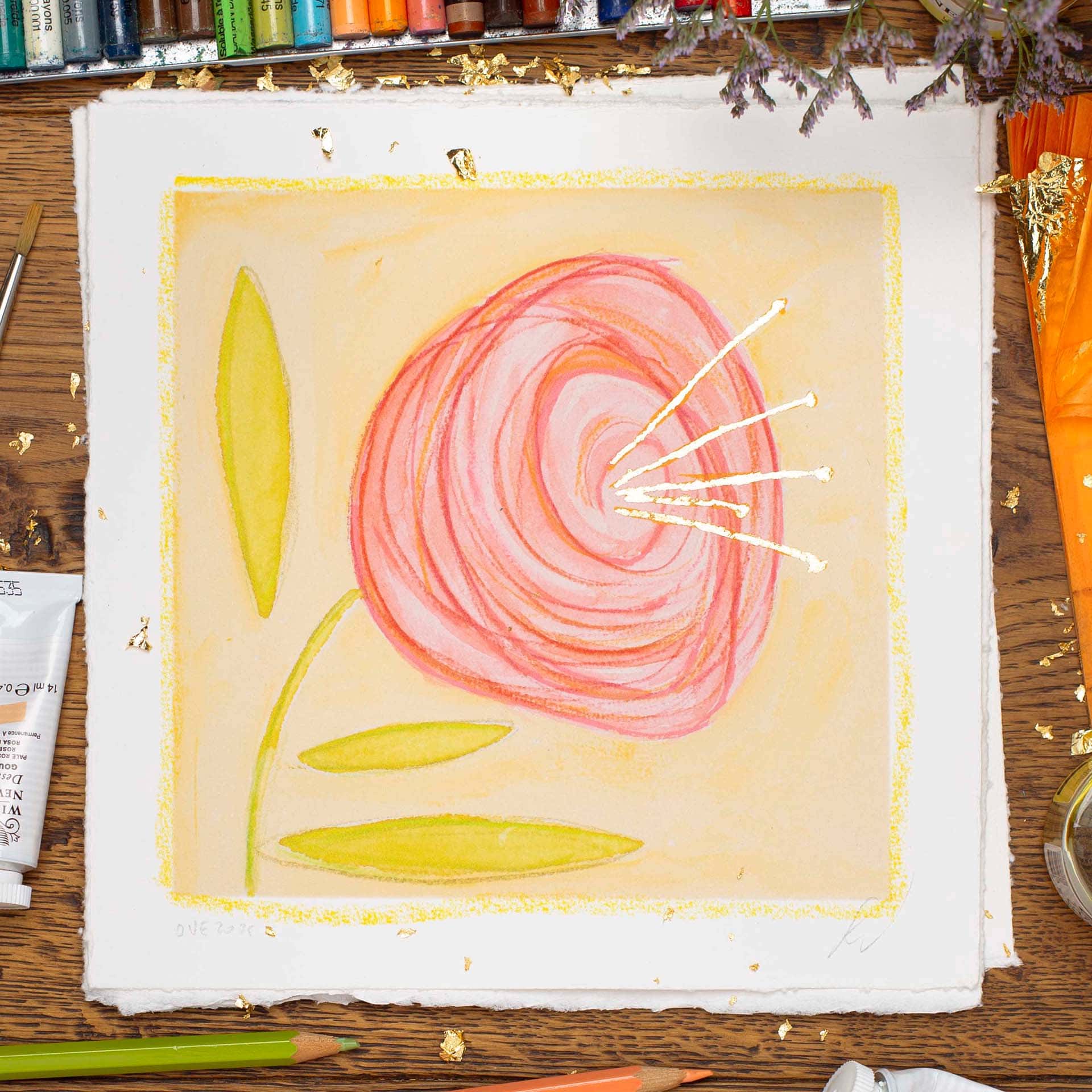- Each print has been hand-finished with gold leaf imitation application + crayon interventions, making each print one-of-a-kind