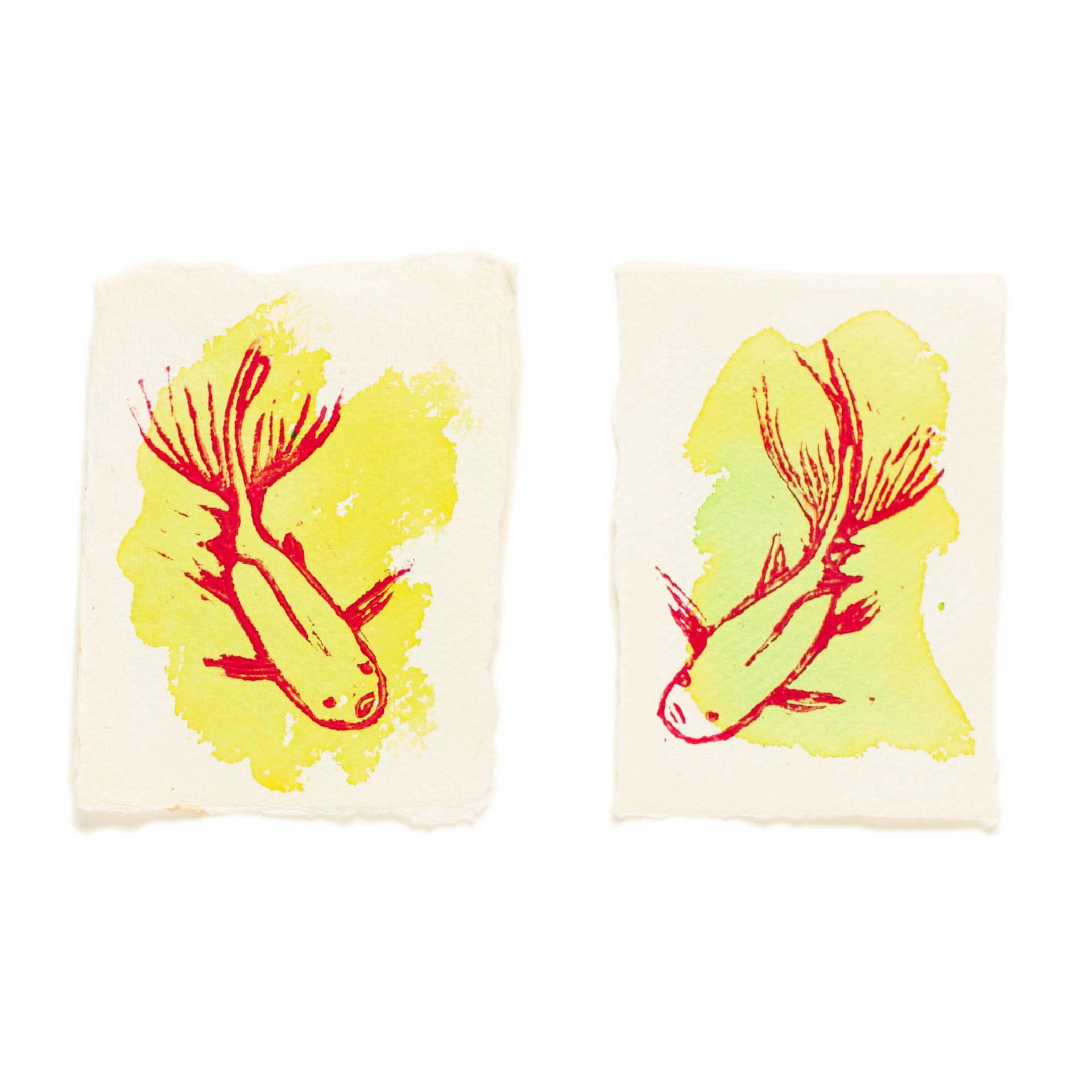 - These are 2 original, hand carved and hand pulled linoprints on an ink background.
