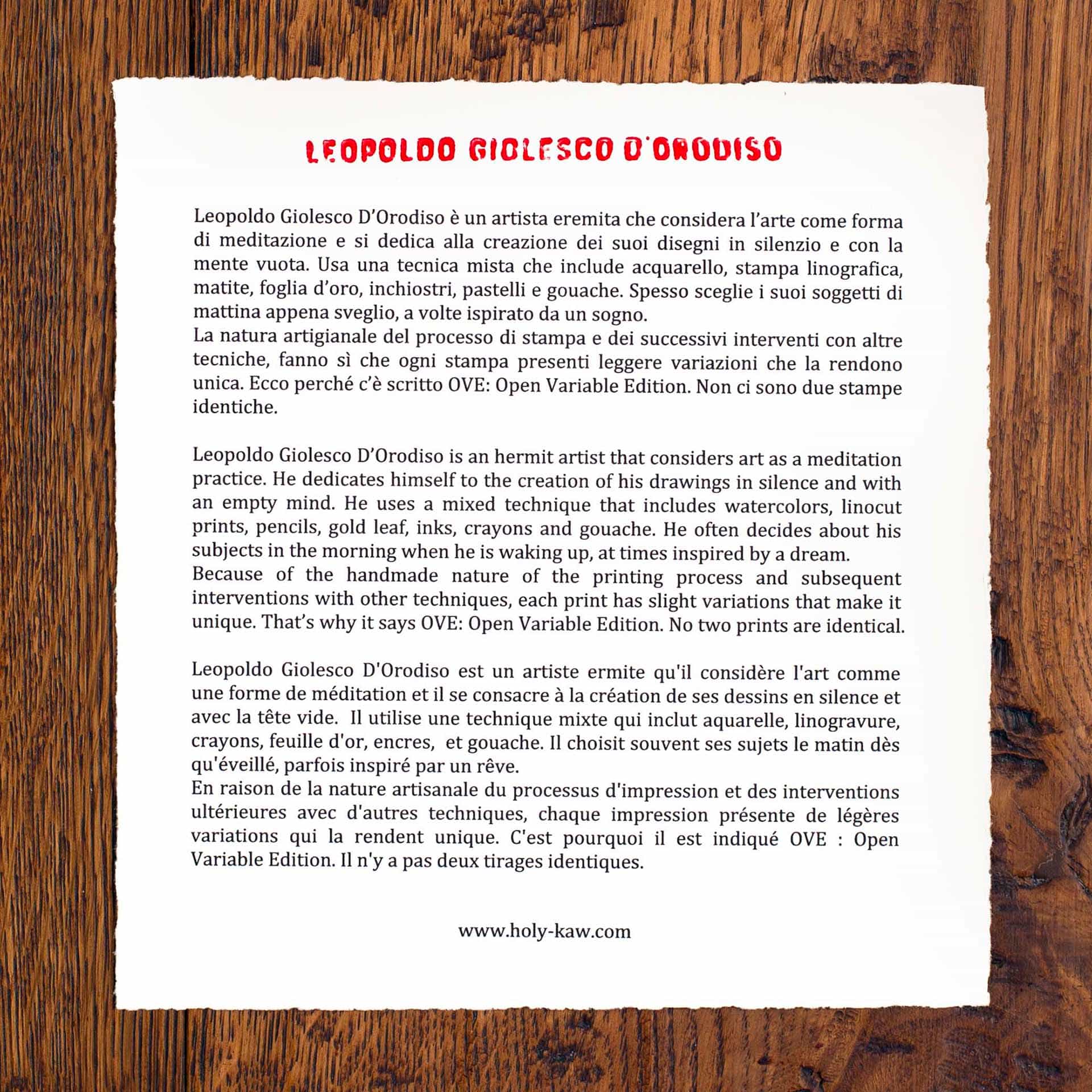 - Due to the handmade printing process, each print has slight variations, making it one-of-a-kind. This is why each piece is labeled as an OVE: Open Variable Edition – no two prints are exactly alike.