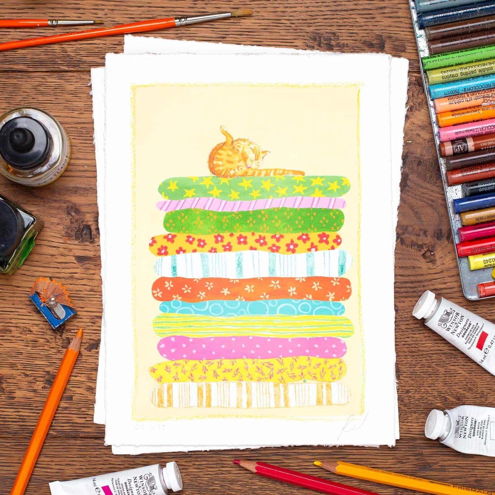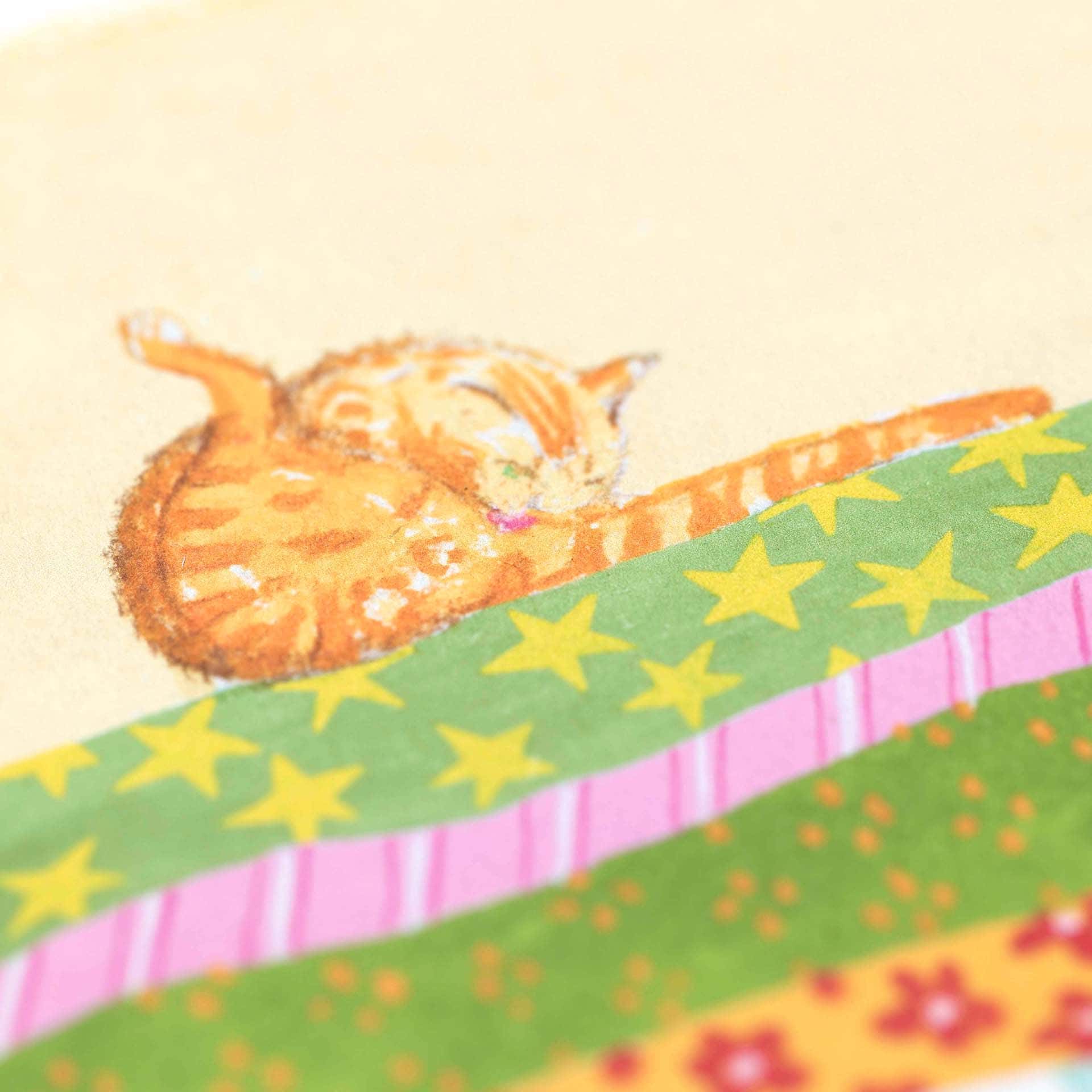 This is a cat digital fine art print, produced using a 12-color Giclée printing process from an original made in gouache, inks, pencils and crayons
